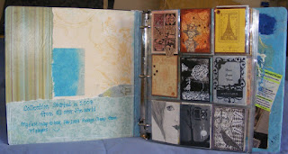 Here are some pictures of a regular vinyl binder I covered with scrapbook papers and mod podge. I painted the inside back cover before adding some mail art type collage material. I use the binder to showcase my ATC collection. I don't make these much anymore. I may join a swap or two this winter on the yahoo group I belong too. I have ATC's from all over the world. It was my introduction into mail art and swapping. I have participated in altered book & art journal round robins, partnership art journals, swapped art tags and much more. I think I get alot of inspiration when I am involved in swapping. Deadlines encourage my muse somehow.